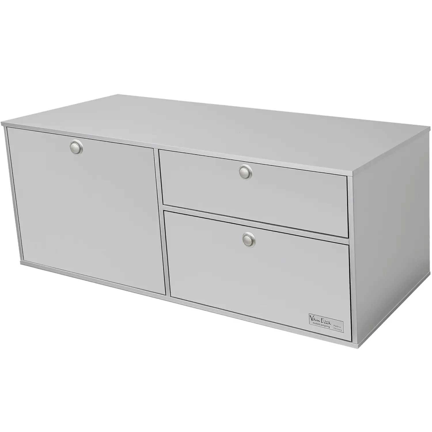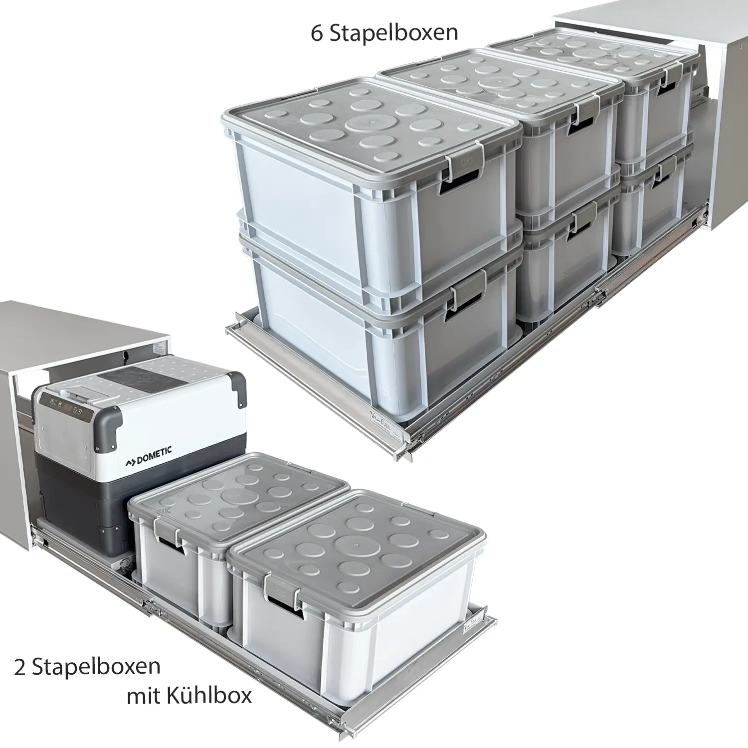 It is fixed on the heavy-duty pull-out, behind which there is still space for the Dometic CFX2 28 compressor cooler. Another option is the Arco storage module instead of the kitchen. Alternatively, you can use the practical Stacking boxes