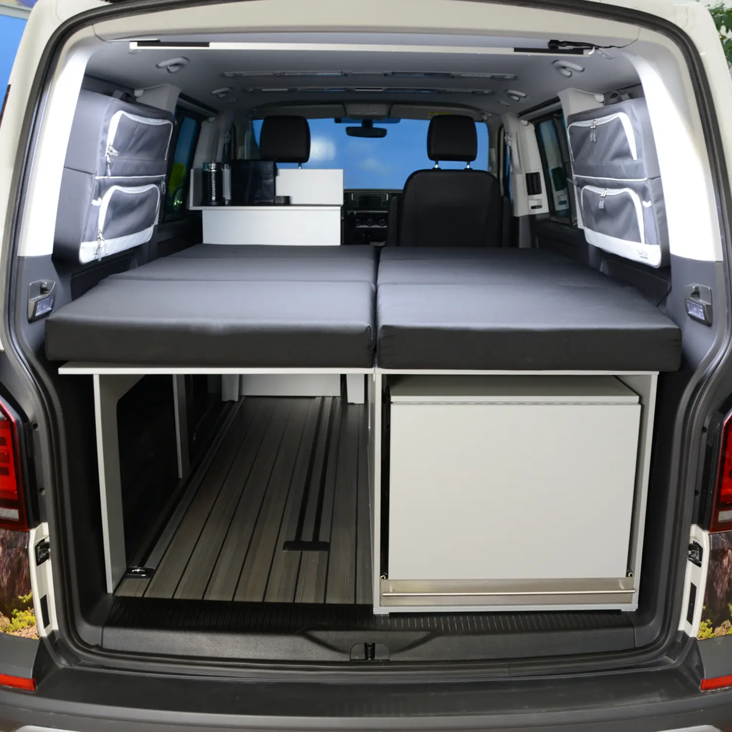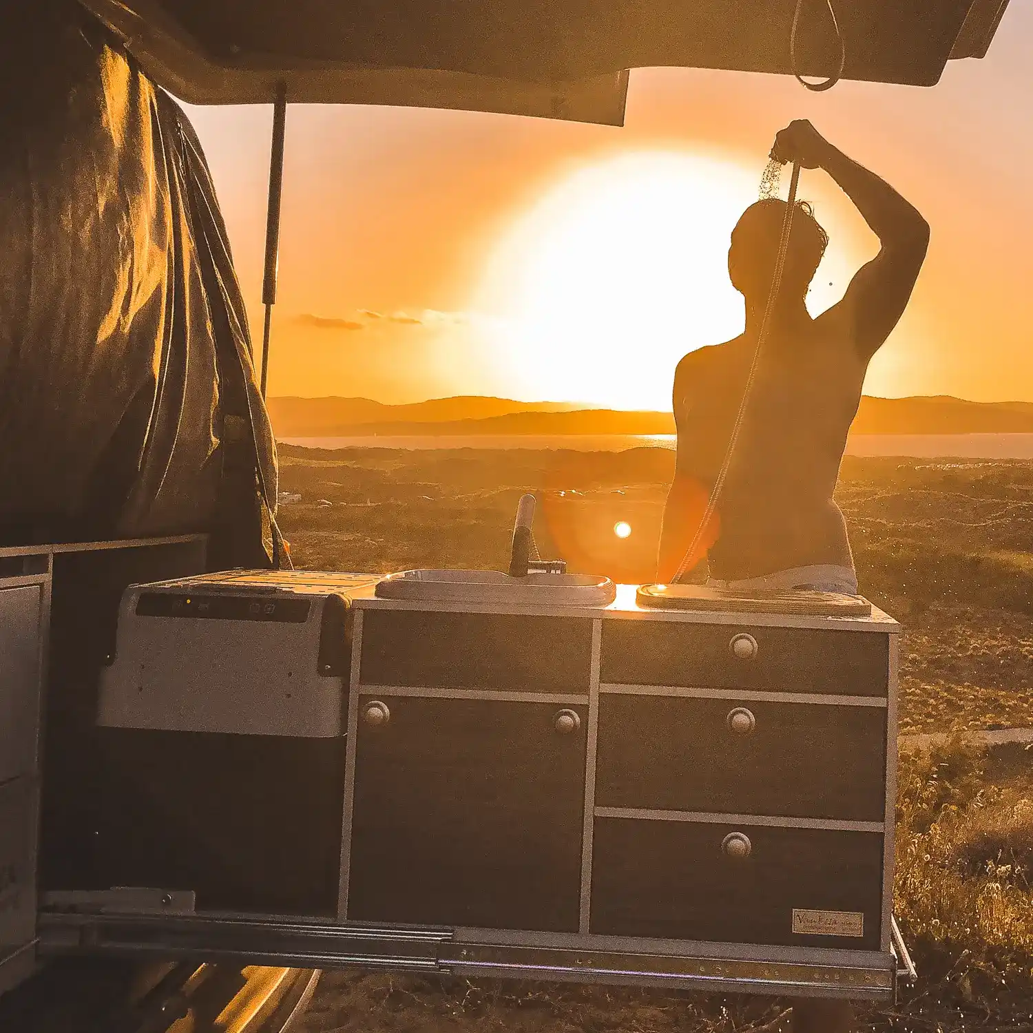 From everyday car to mobile camper in just a few minutes. The VanEssa Arco modular kitchen is the perfect addition to your VanEssa Arco System rear extension for spontaneous camping trips - mobile and compact.