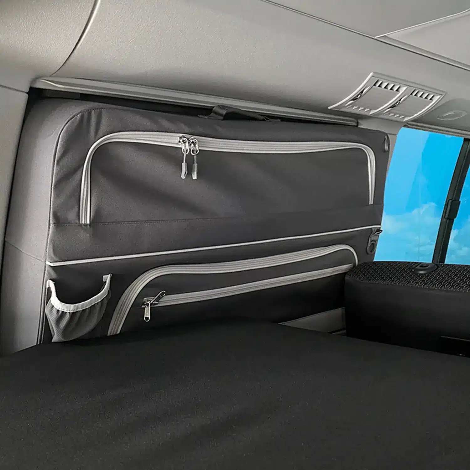 Use every corner of your van as valuable storage space. The original VanEssa window bags for your Caravelle are specially designed to meet your camping needs: Stow, organize, darken and insulate at the same time.
