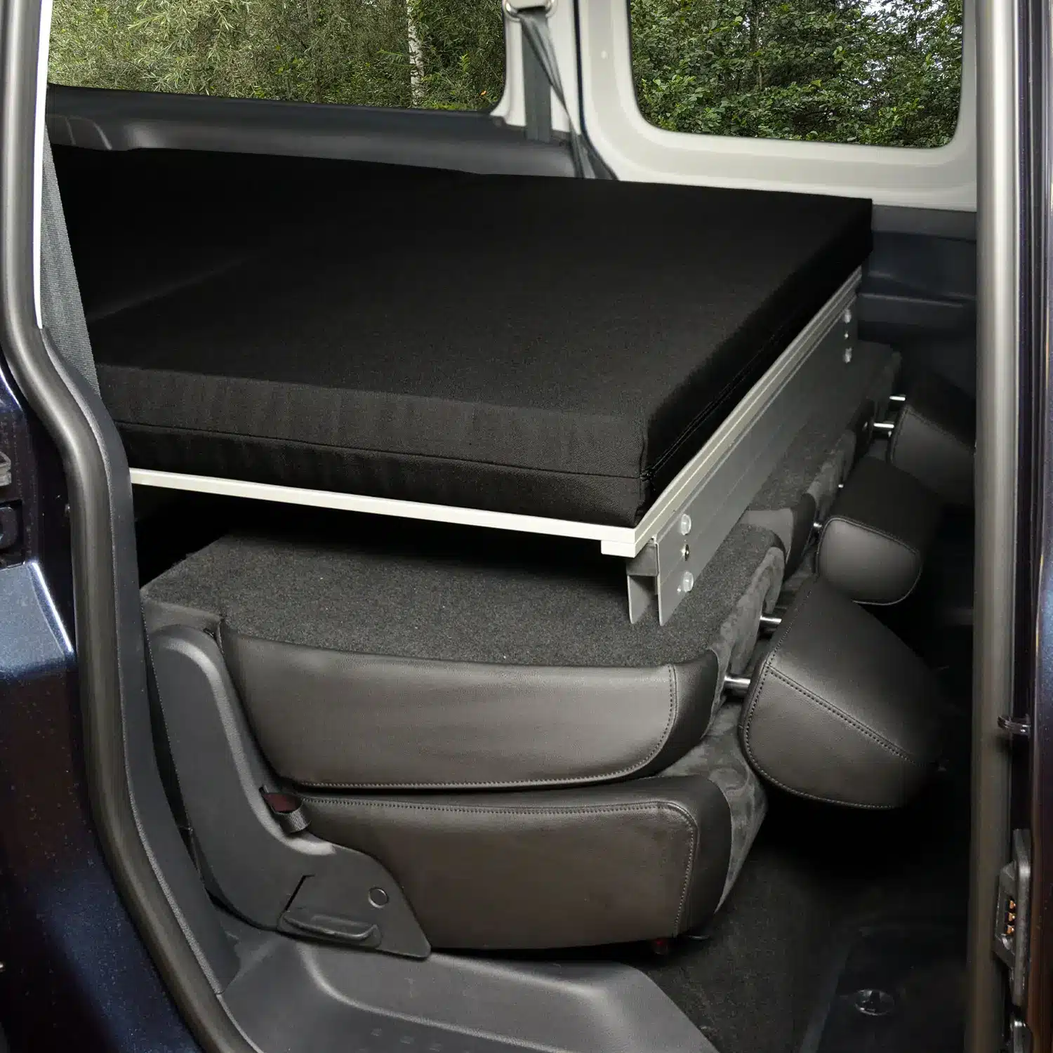 Our VanEssa sleeping system also transforms this interior into a comfortable sleeping area for two people. The rear seats remain in the vehicle.