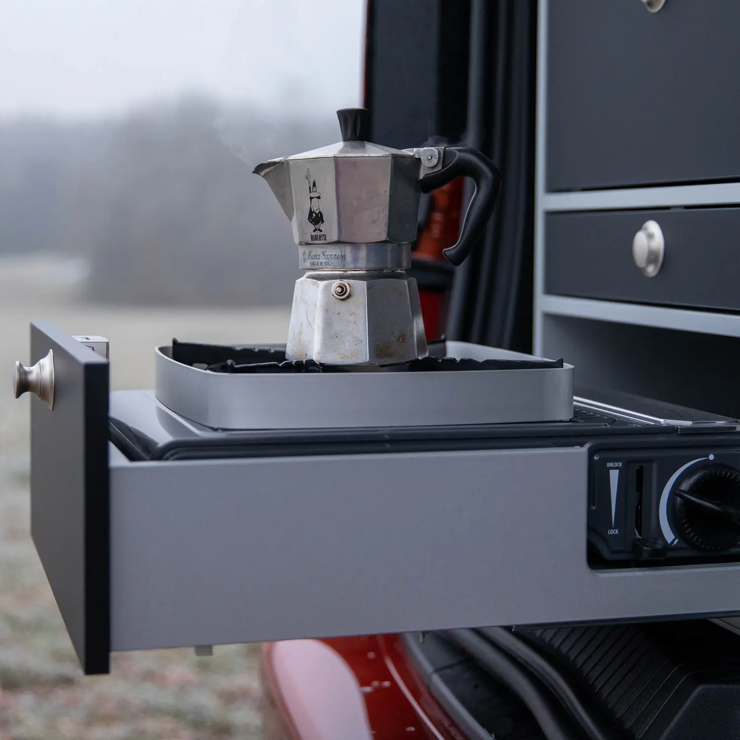 The camping kitchen for flexible self-catering. Your perfect travel companion, from coffee in the morning to a convivial barbecue evening. The kitchen is already fully assembled and can be attached to your minivan in just a few minutes. With the fully equipped kitchen, you are completely independent of rest stops and restaurants on your tour.