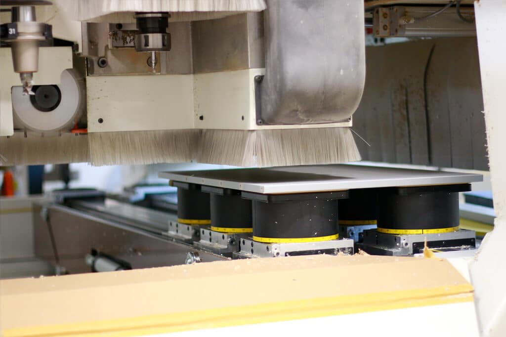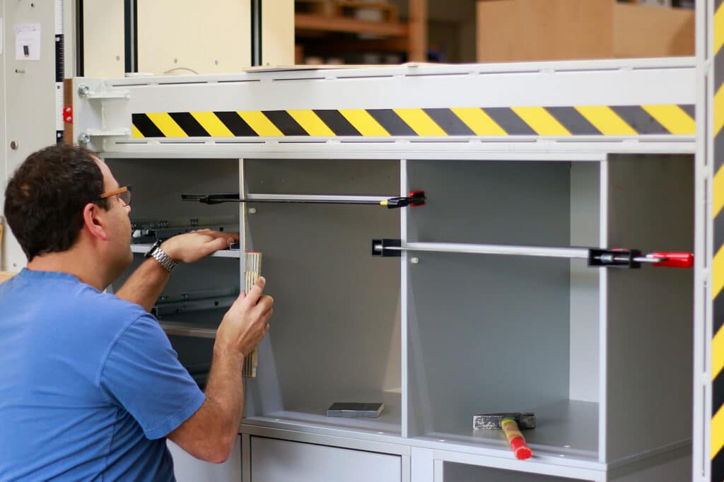 In our workshop, carpenters and master carpenters use professional machines and tools to expertly manufacture the individual panels into sleeping systems, kitchens and wardrobe interior modules. For the kitchen, for example, we also use special presses to ensure that everything is at right angles to each other.