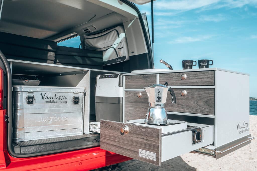 A camping box is already ready to go. One from VanEssa mobilcamping just needs to be pushed into the vehicle and fixed in place. In just a few minutes, your everyday car or work vehicle can be converted into a camper van!