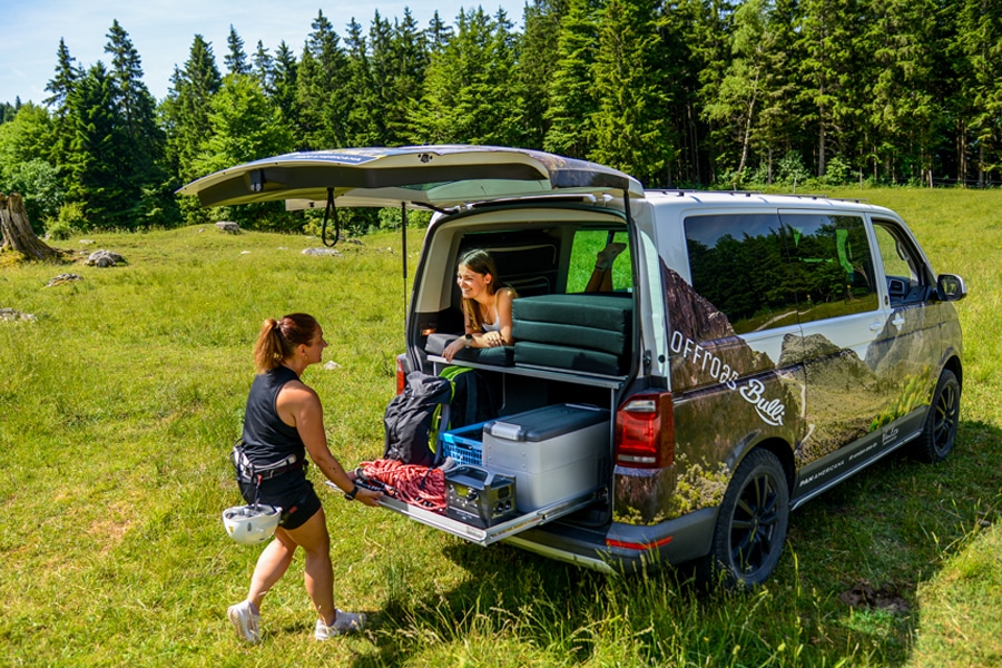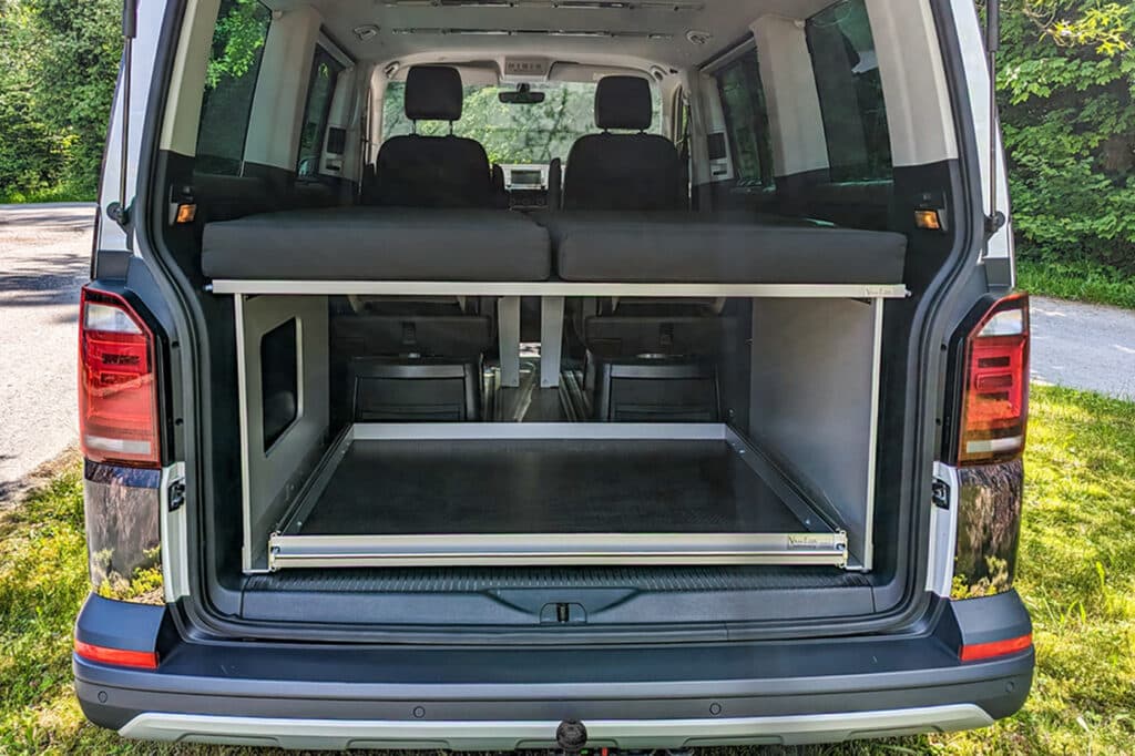 The VanEssa rear pull-out is equipped with VanEssa sleep systems such as the surfer bed (also split) or van bed and can be retrofitted without additional effort. Both can also be used independently of each other.