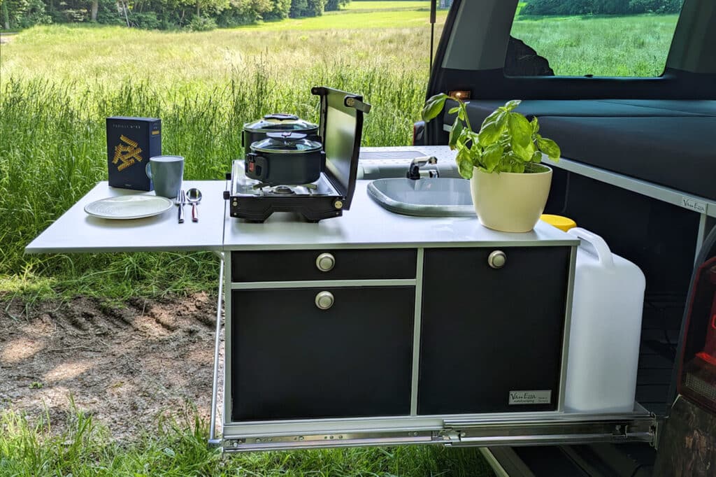 The right VanEssa kitchen module Riva with sink, storage space and cooking facilities just needs to be placed on the rear pull-out and fastened and you're ready to go.