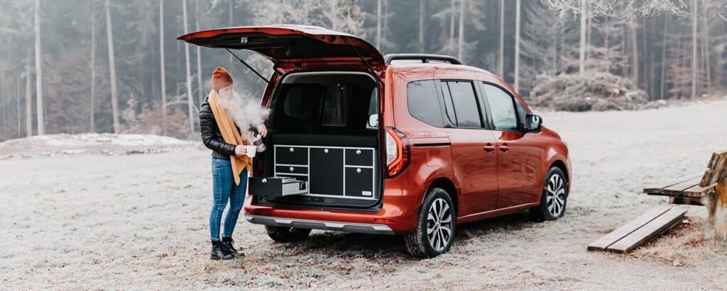 An indoor kitchen can be very practical for trips that tend to take place in the north (Scandinavia) or in winter, as you are rarely outside for breakfast etc. here. An indoor kitchen can also be practical for shorter weekend trips or day trips. Here too, it is important that your clothes are not in the trunk, but are accessible from the inside. Depending on the type of vehicle, we recommend using our panniers as additional storage space.
