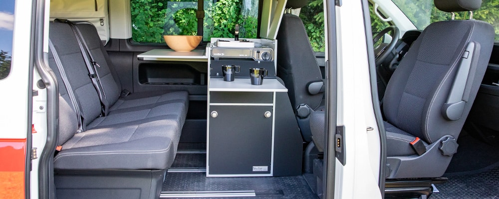 The majority of campers prefer to travel in summer and when the weather is nice. This means they spend most of their time cooking outside. There is plenty of space in the trunk of the van for all kitchen utensils and food. This means that you don't need any more boxes to be stored in the vehicle, which can quickly become disorganized. Unpleasant smells, such as those from a barbecue, are kept outside.