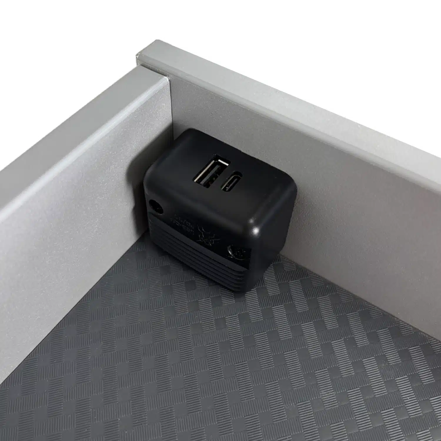 - zwei USB-Steckplätze (USB-A/USB-C) an Innenseite des Aufsatzboards