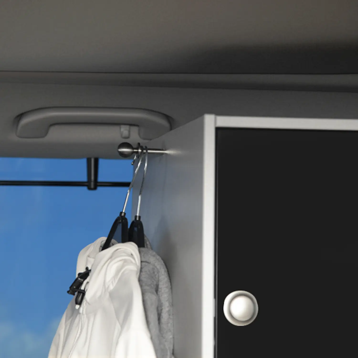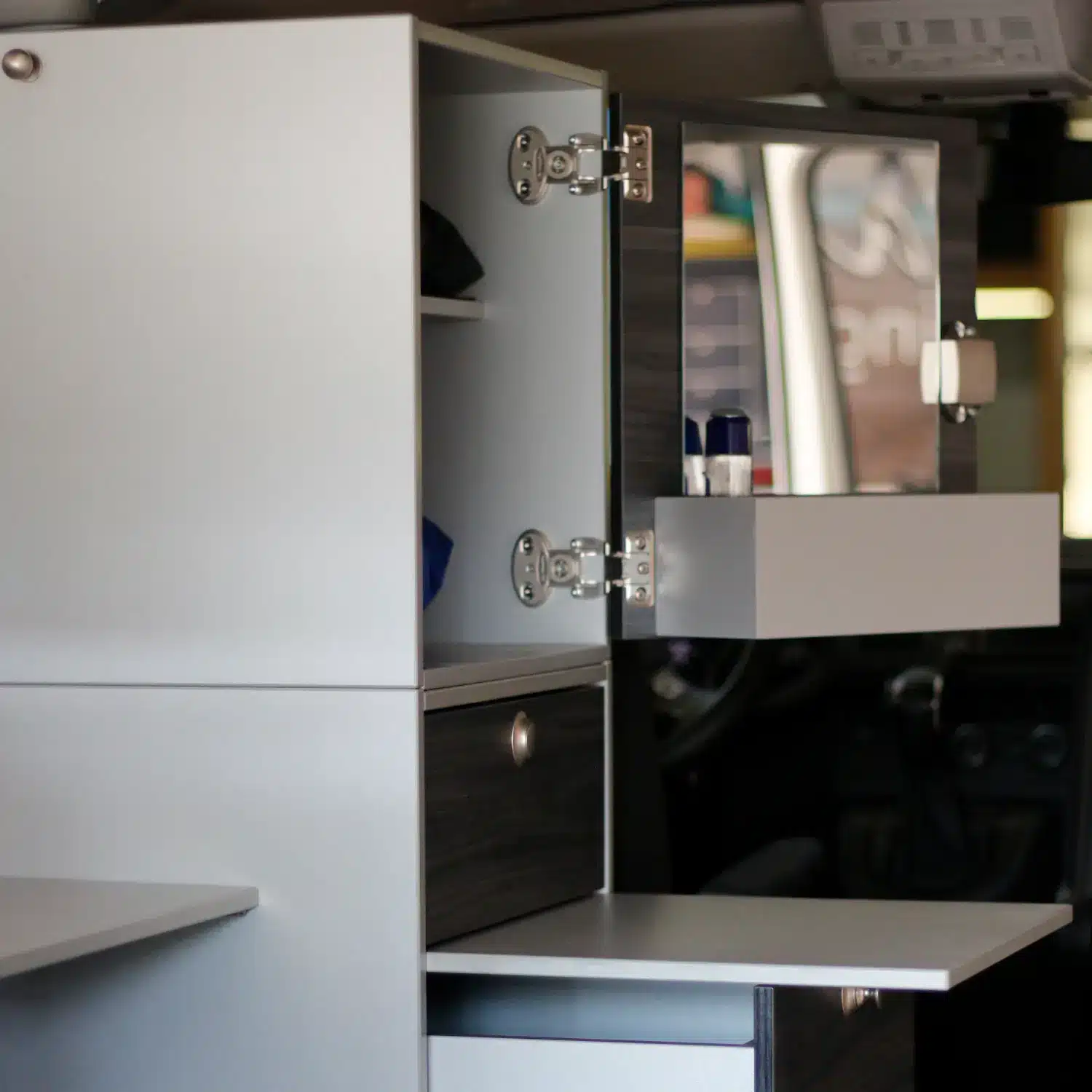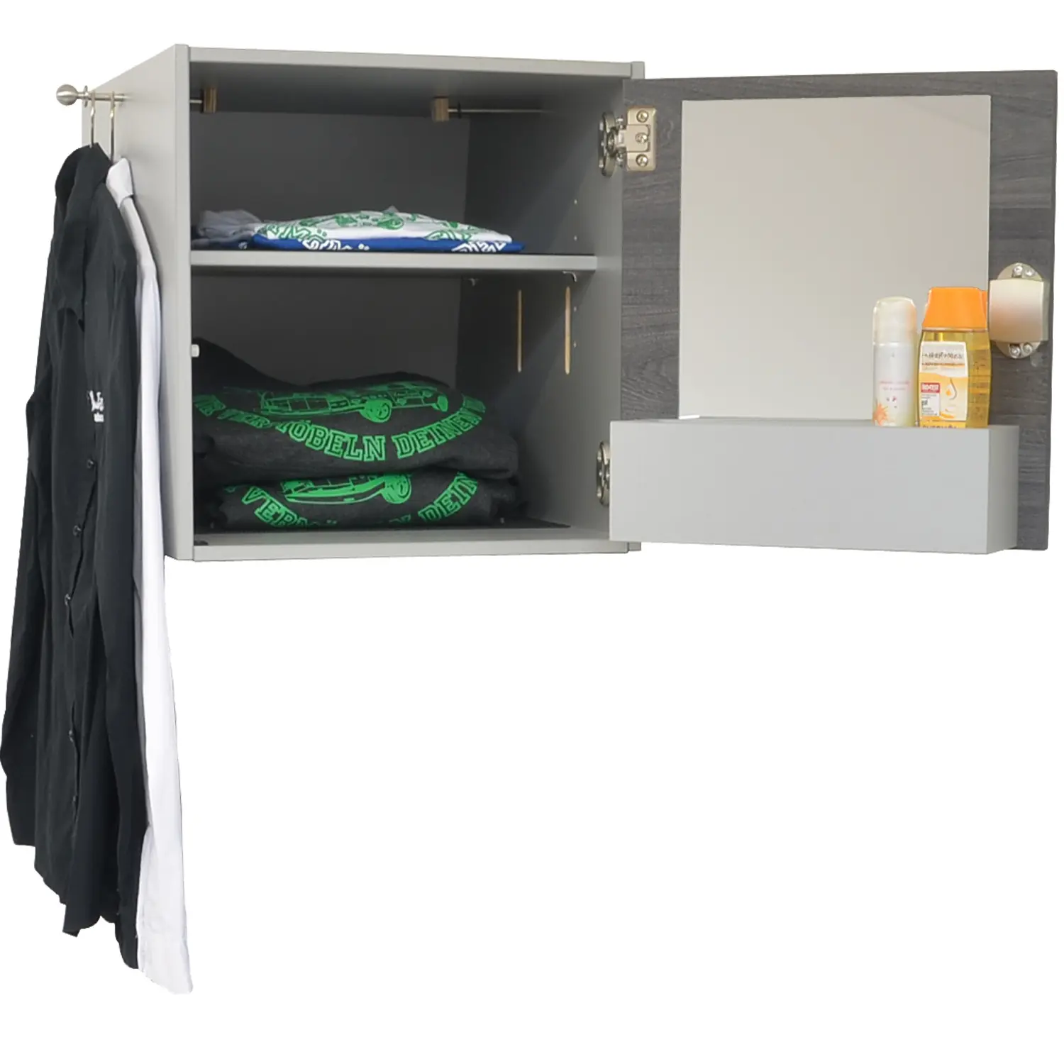 Unser praktischer Aufsatzschrank verwandelt deinen Modulturm im Handumdrehen in ein echtes Stauraum-Wunder. Ob T-Shirts, Kosmetik, Kamera oder Reisespiele – alles hat seinen Platz, ist ordentlich verstaut und sofort griffbereit. So bleibt dein Van im Alltag flexibel – und wird bei Bedarf zum perfekt ausgestatteten Camper.