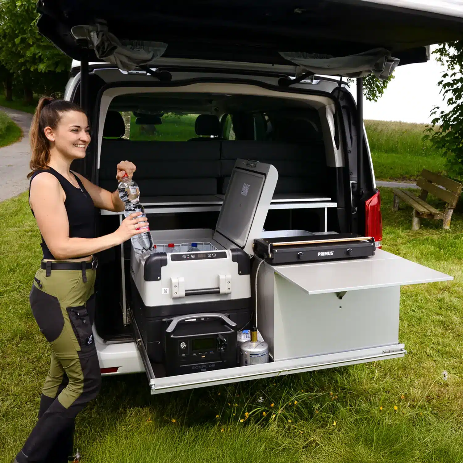 In nur wenigen Minuten vom Alltags-Auto zum mobilen Camper. Die VanEssa Modulküche Riva ist die perfekte Ergänzung zu deinem VanEssa Heckauszug für spontane Campingtrips – mobil und kompakt.