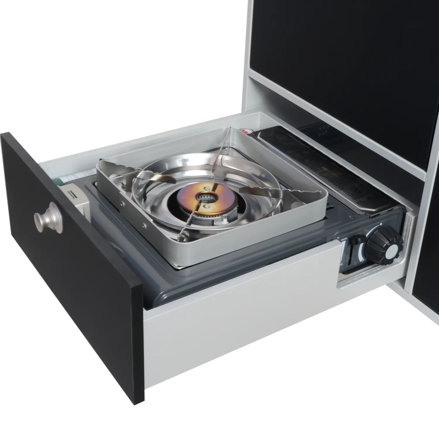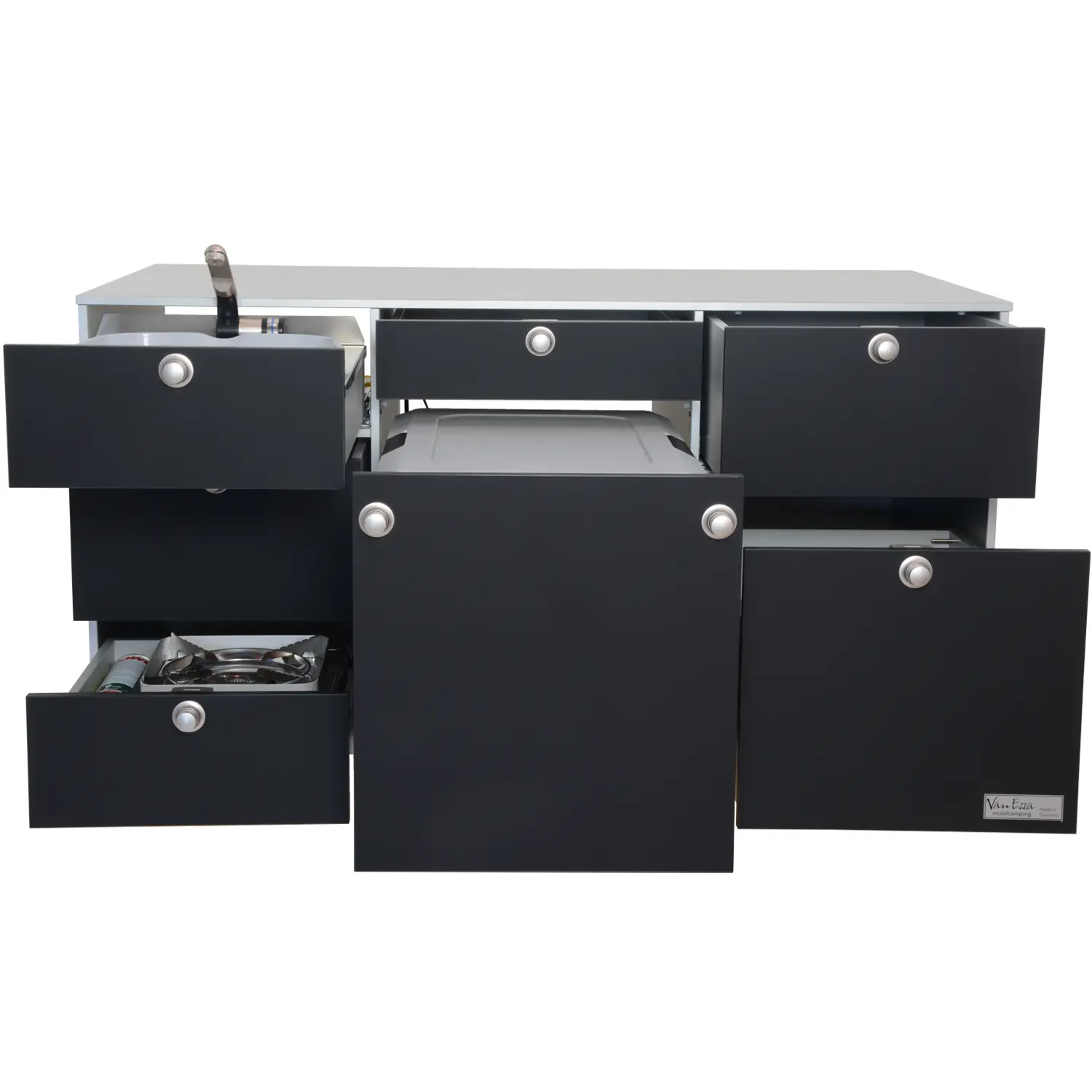 Die Campingküche für den flexiblen Selbstversorger. Vom Kaffee am Morgen bis hin zum geselligen Grillabend dein perfekter Reisebegleiter. Die Küche ist bereits komplett zusammengebaut und in wenigen Minuten in deinem Van befestigt. Mit der vollausgestatteten Küche bist du auf deiner Tour völlig unabhängig von Raststätten und Restaurants.