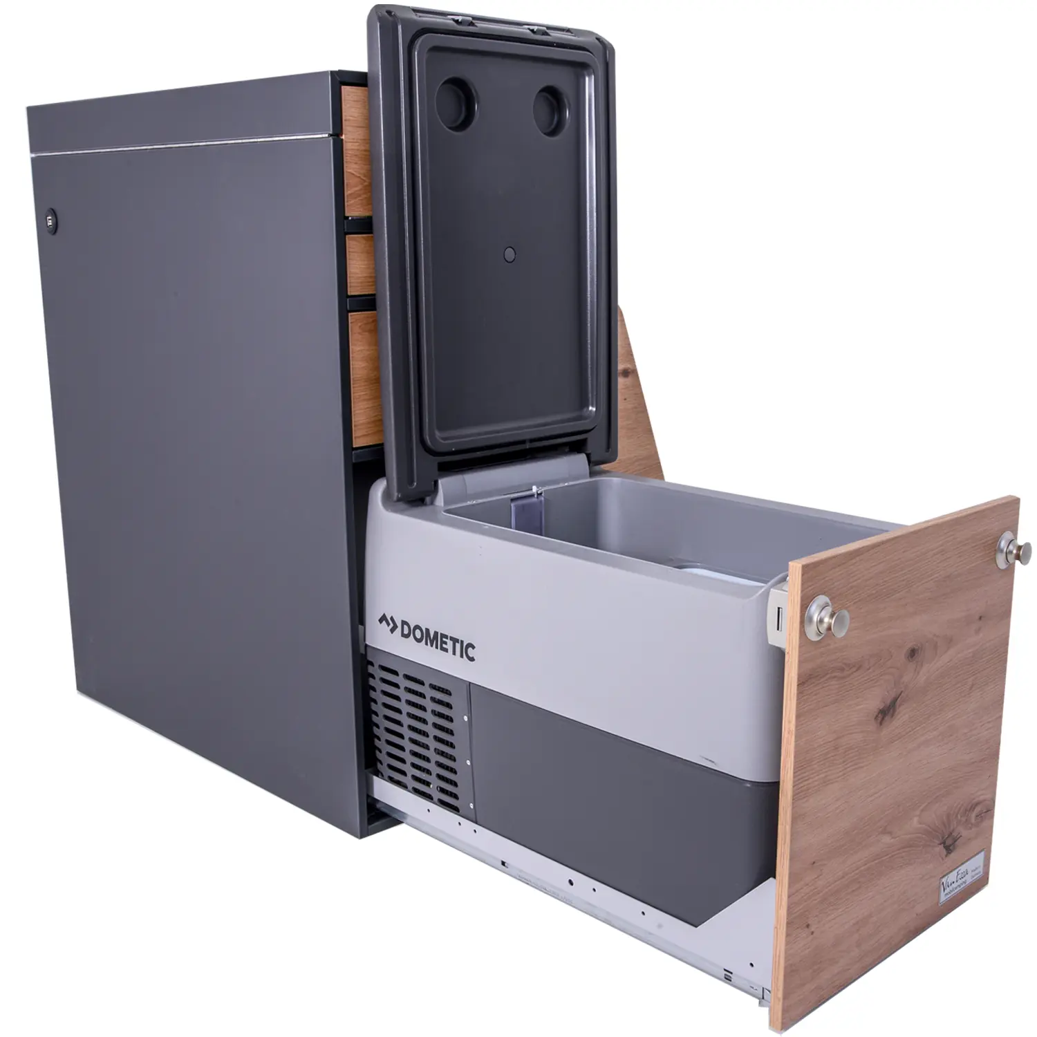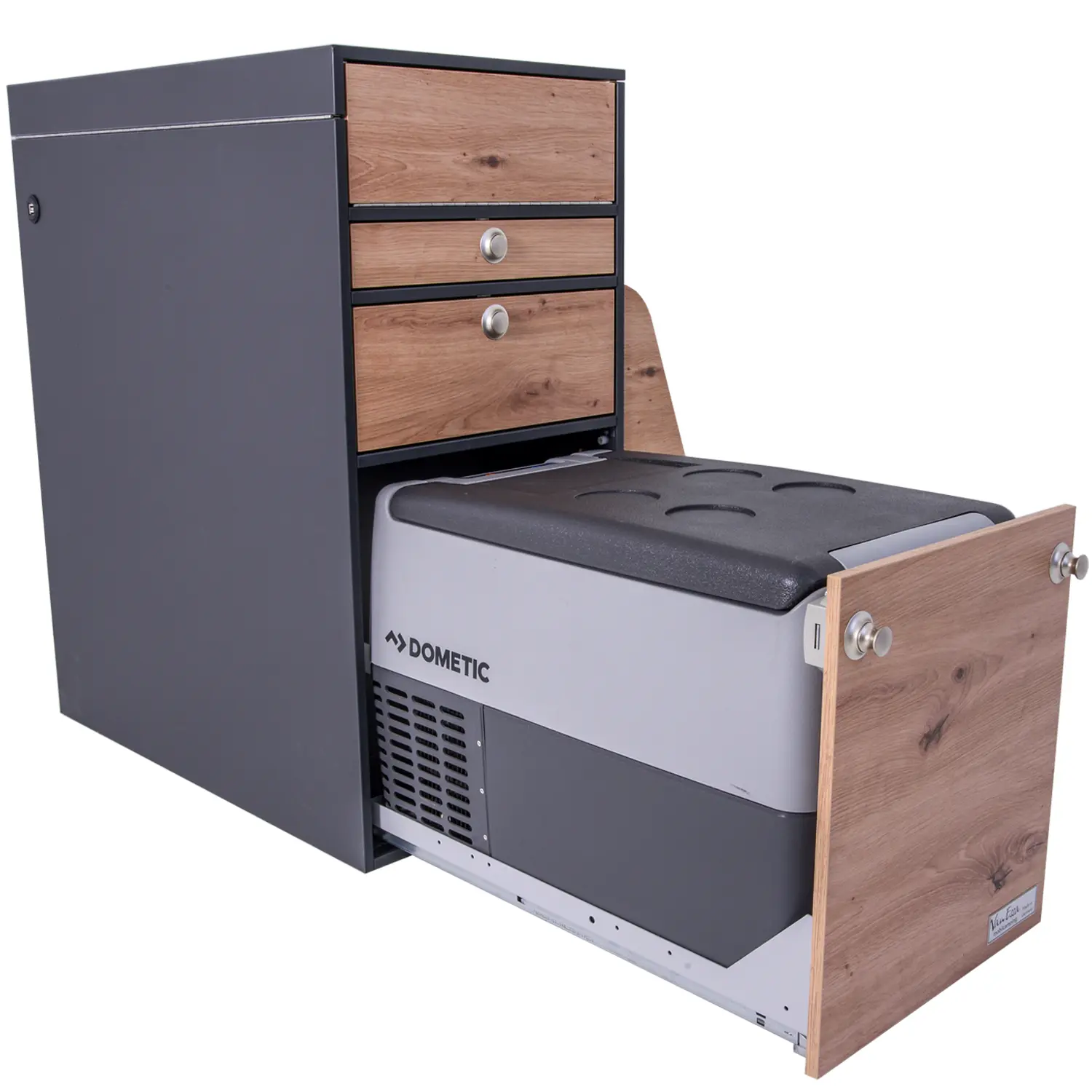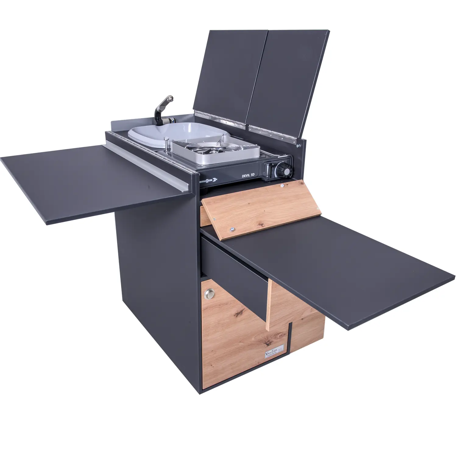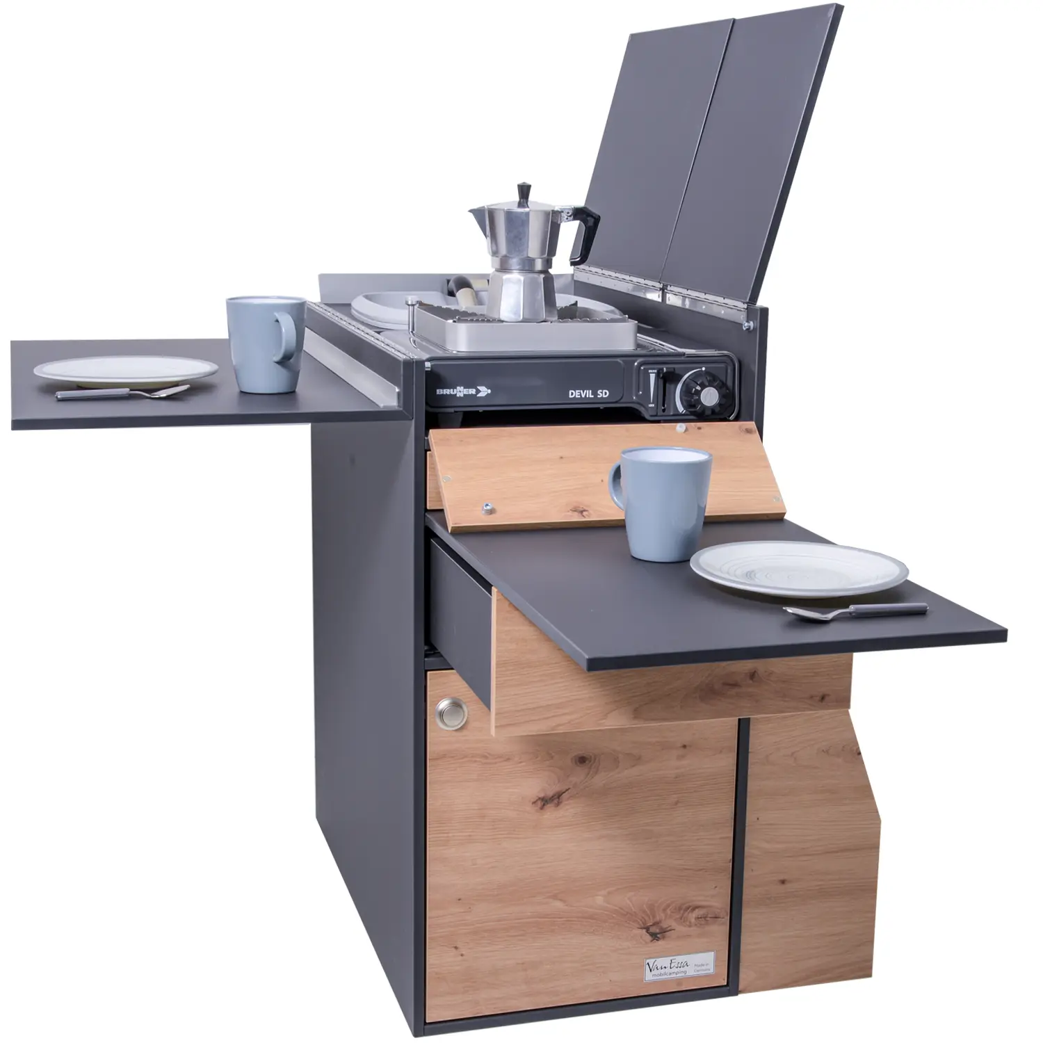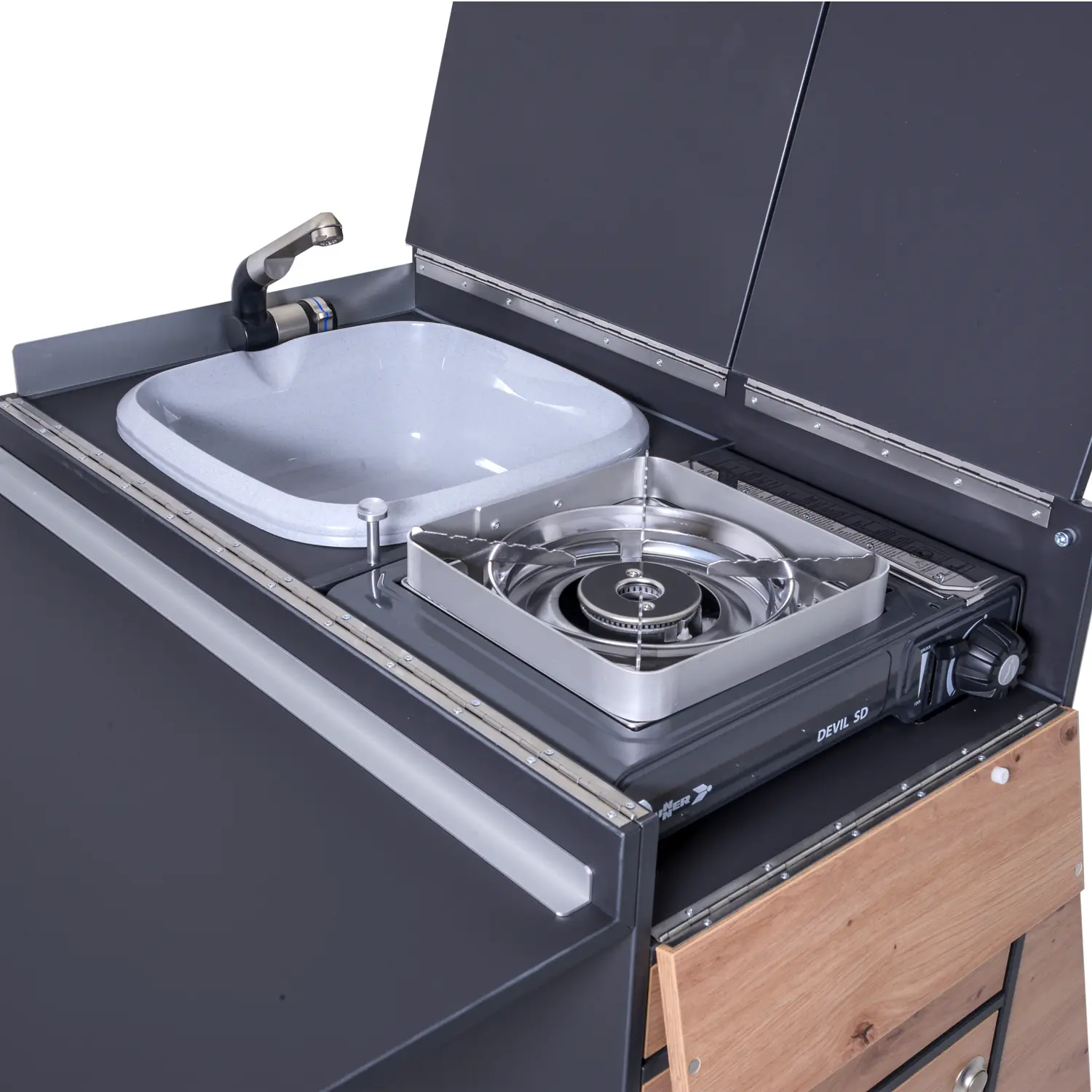 Das autarke Küchenmodul Oslo für den Fahrzeuginnenraum bietet dir große Flexibilität und alles, was du zum Kochen, Kühlen, Spülen und Verstauen benötigst.