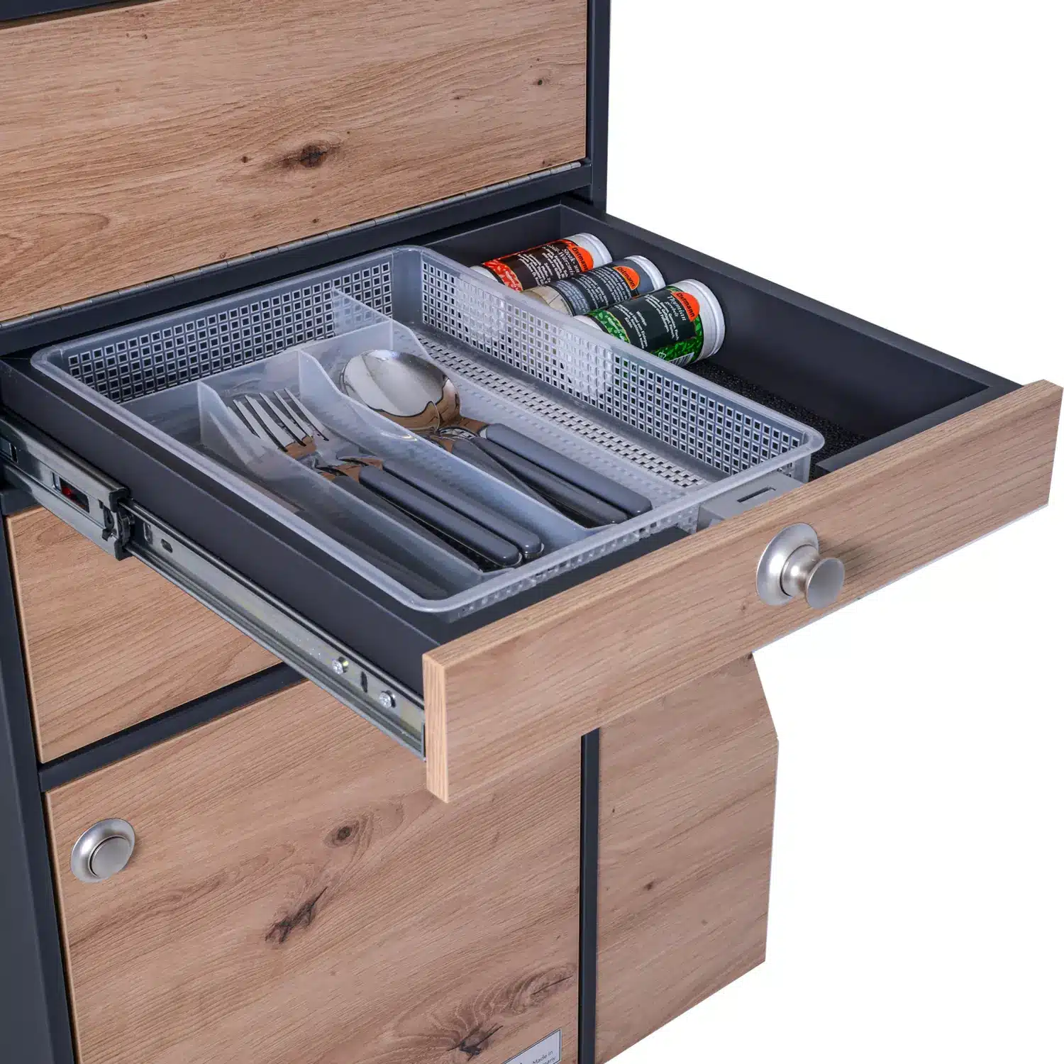 - Auszug optional erweiterbar durch einen Stauraum-Einsatz : Einsatz mit Boden und Seitenwänden für Lebensmittel, Geschirr, Kleidung etc. (optional per Dropdown)