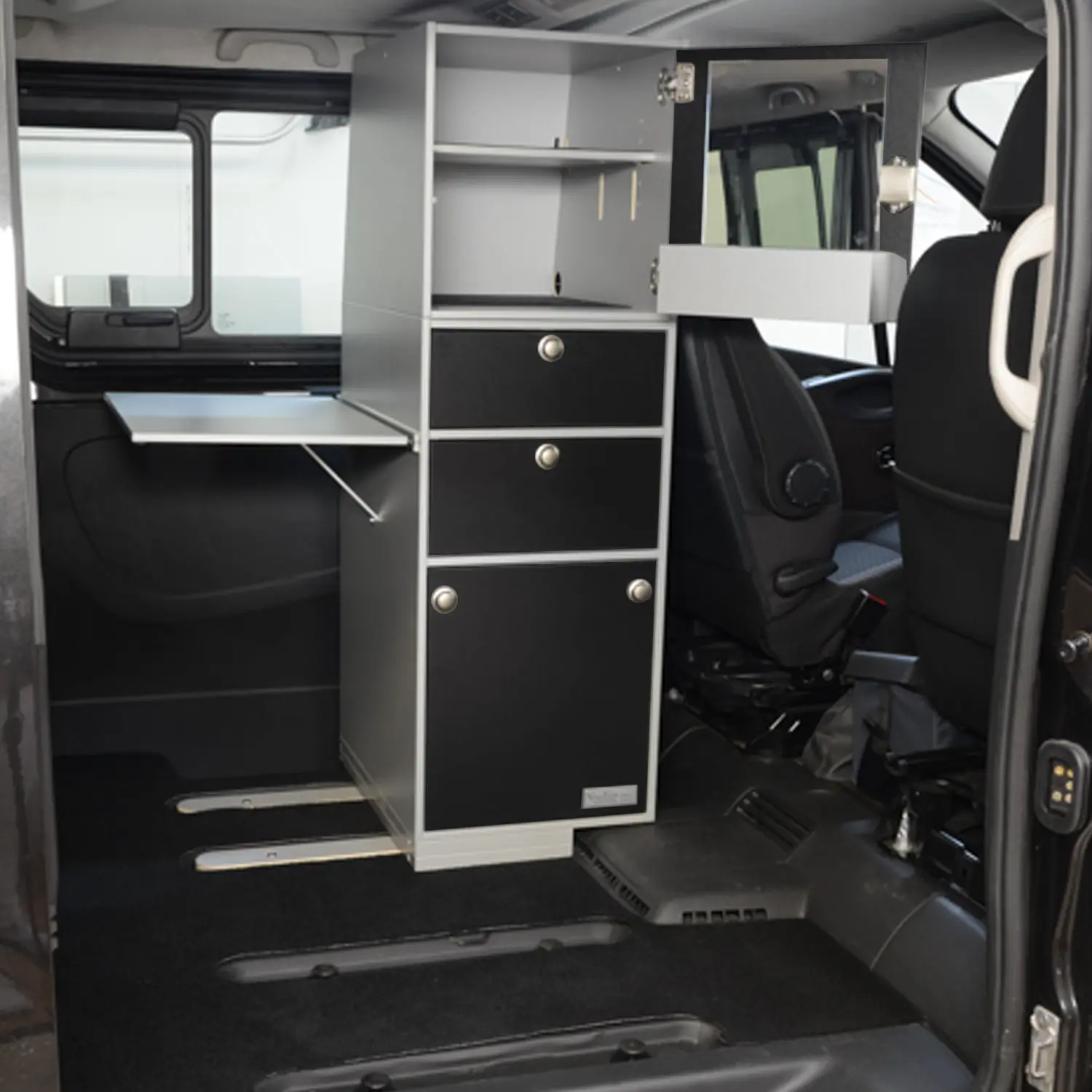 Kleidung, Kosmetika, Laptop, Spiele und vieles mehr finden Platz in Schubkästen in verschiedenen Größen. So findest du auch unterwegs immer alles – kein Suchen, kein Herumräumen. Alternativ sind ein WC, eine Kühlbox oder sogar eine Spüle möglich – wähle hier dein Wunsch-Modul.