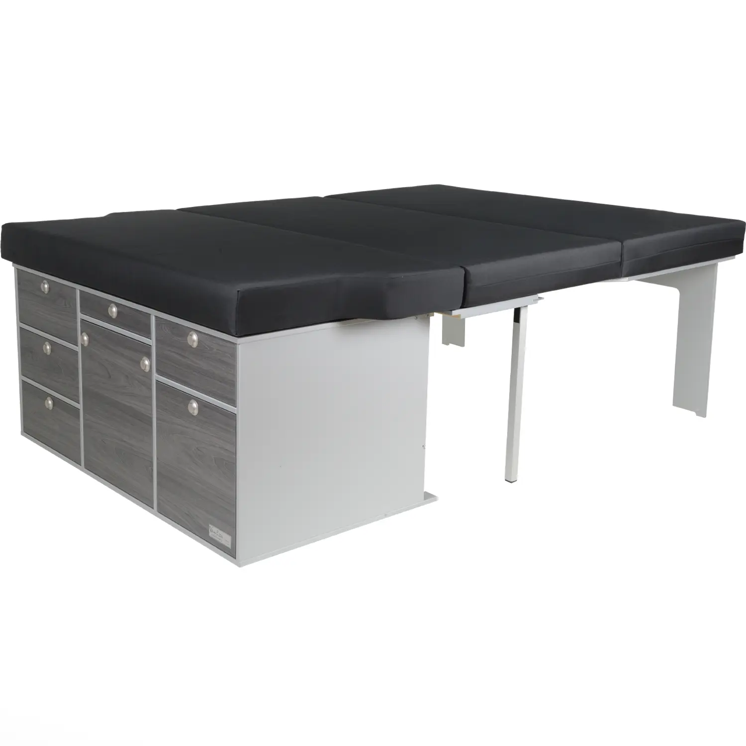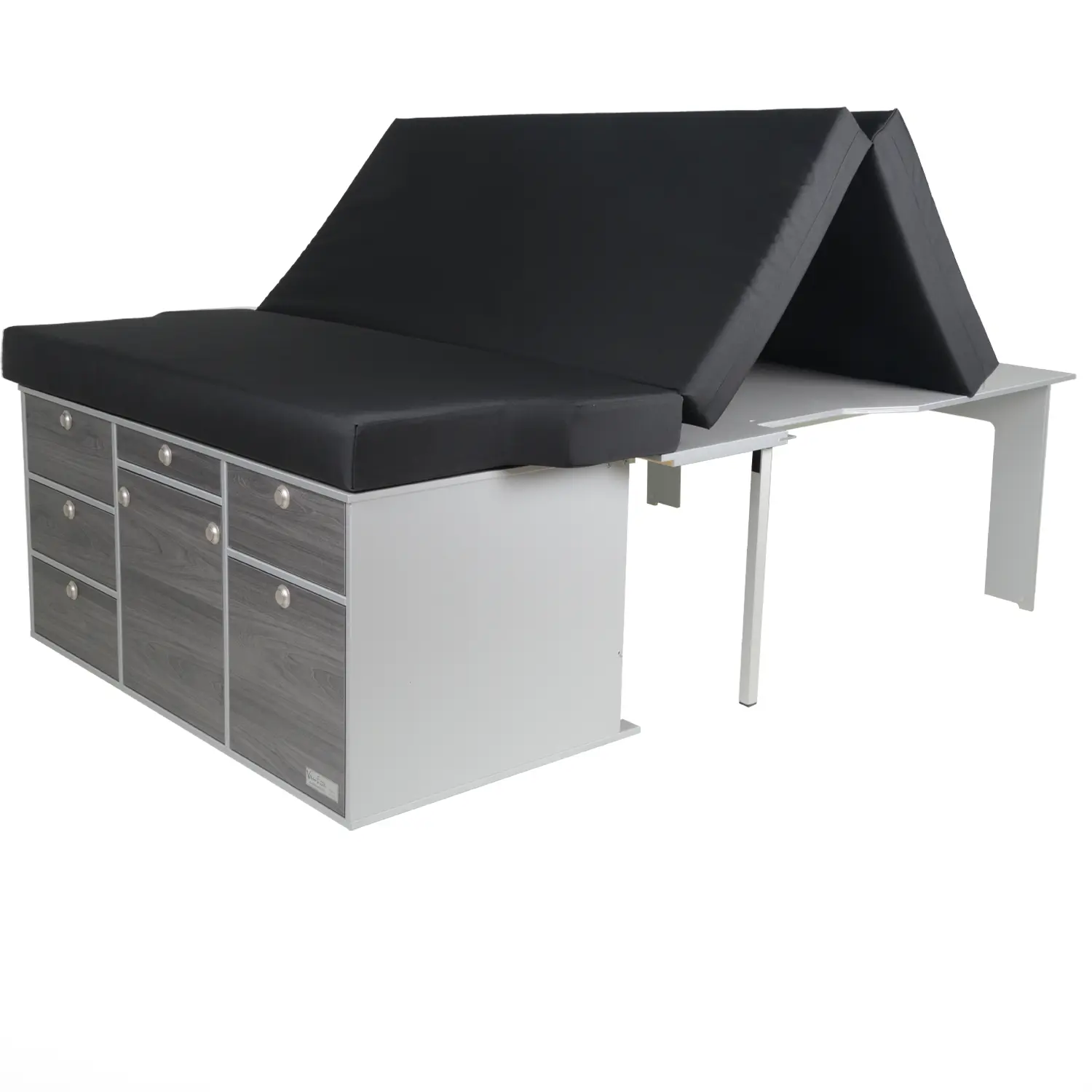 - Schlafboard und Matratze können während der Fahrt platzsparend auf der Heckküche gelagert werden