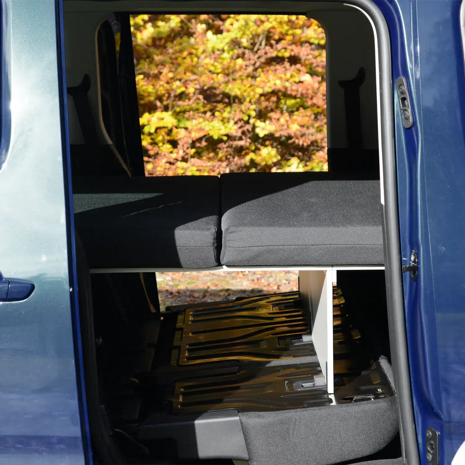 Somit bleibt man flexibel und kann das Bett situationsangepasst nutzen. Während der Fahrt ruht das System im Kofferraum. Der Fahrgastraum und vorhandene Sitze können voll genutzt werden.