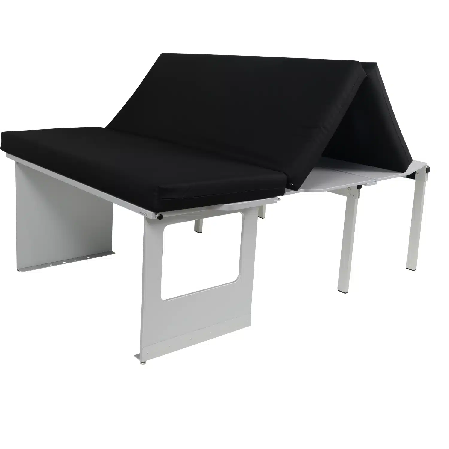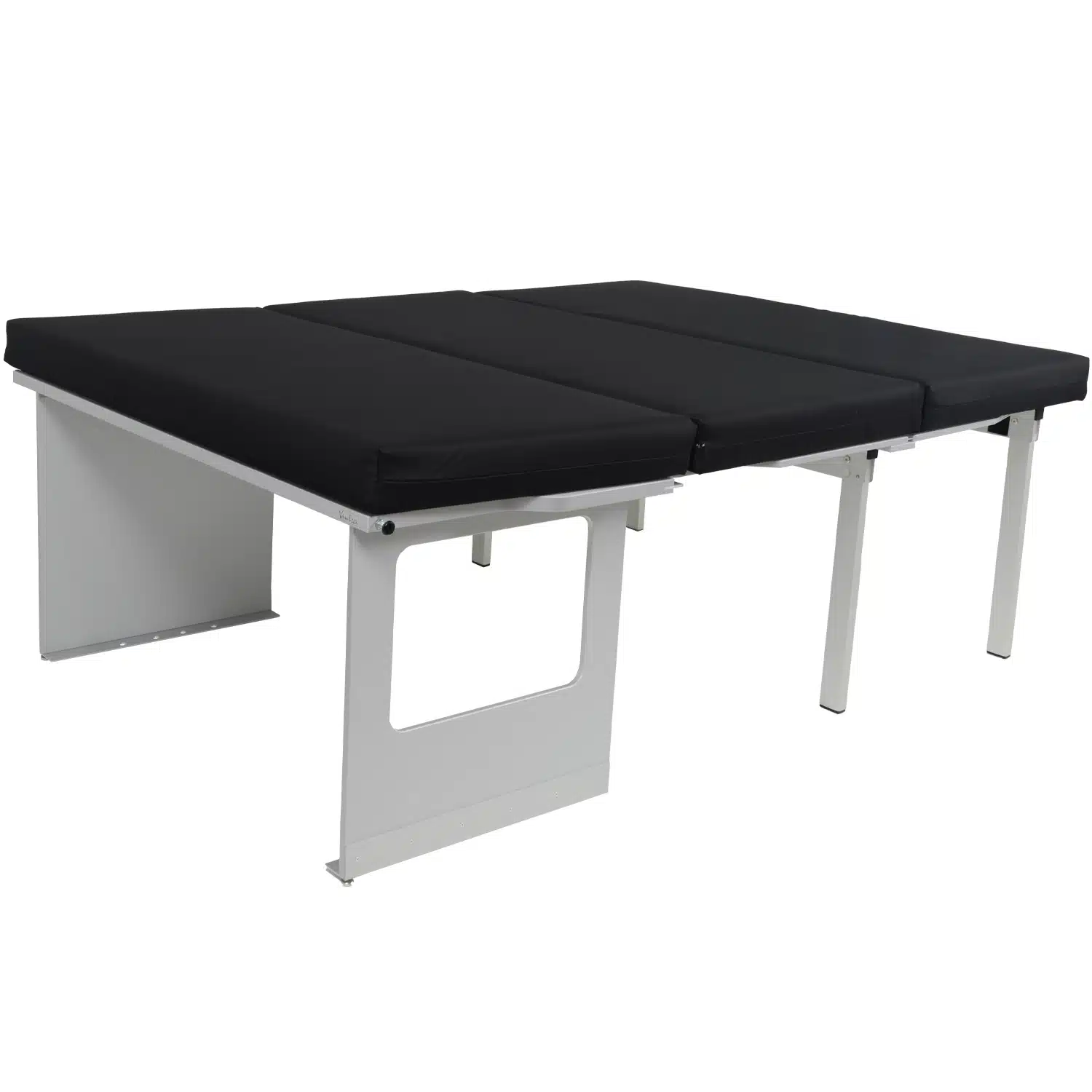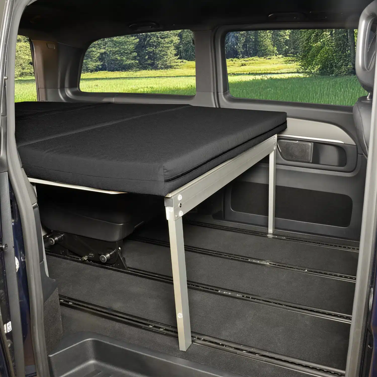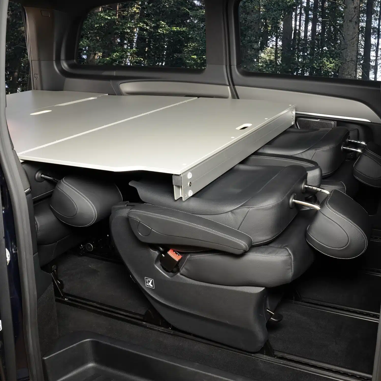 Das Van-Bett ist dreigeteilt und bietet durch das schmale Heckboard viel Platz im Fahrgastraum. Meist sind zwei Sitzreihen möglich (fahrzeugabhängig, siehe Reiter Fahrzeuganforderungen). Mit unserem Campingbett Van, das mit verschiedenen Sitzkombinationen kompatibel ist, bist du sehr flexibel. Vorhandene Sitze können voll genutzt werden. Während der Fahrt ruht das System im Kofferraum.