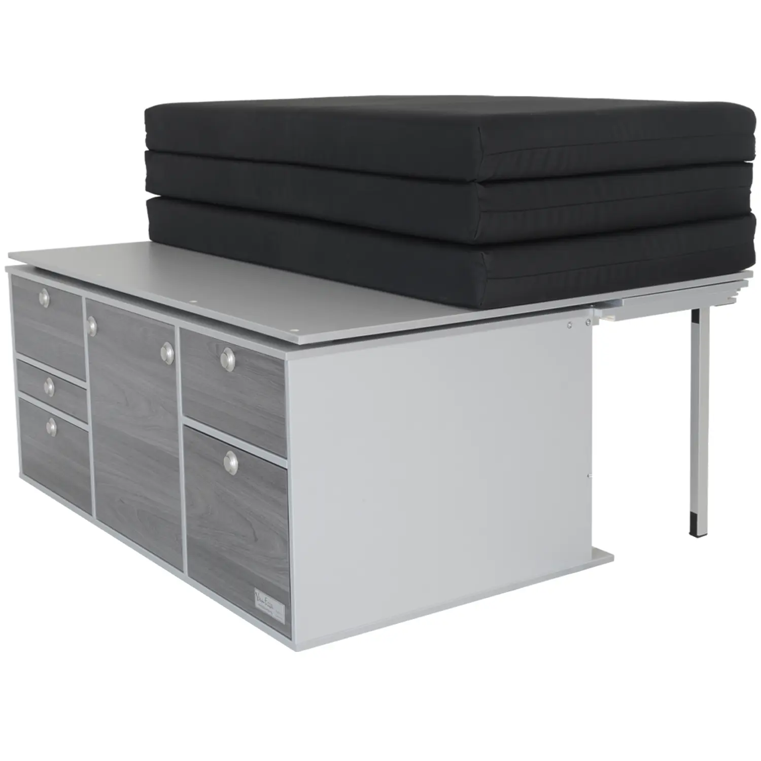 Somit bleibt man flexibel und kann das Bett situationsangepasst nutzen. Während der Fahrt ruht das System im Kofferraum. Der Fahrgastraum und vorhandene Sitze können voll genutzt werden.