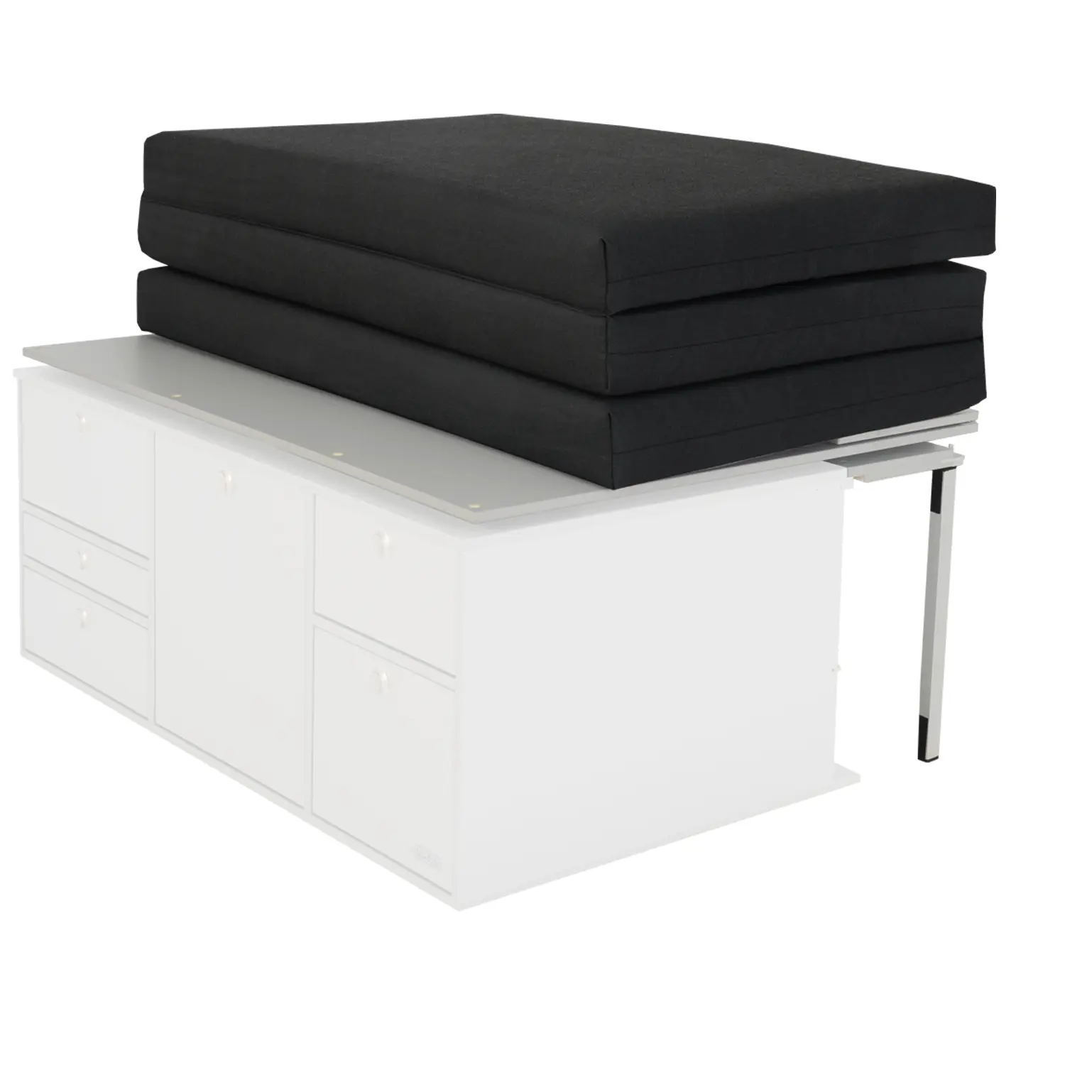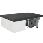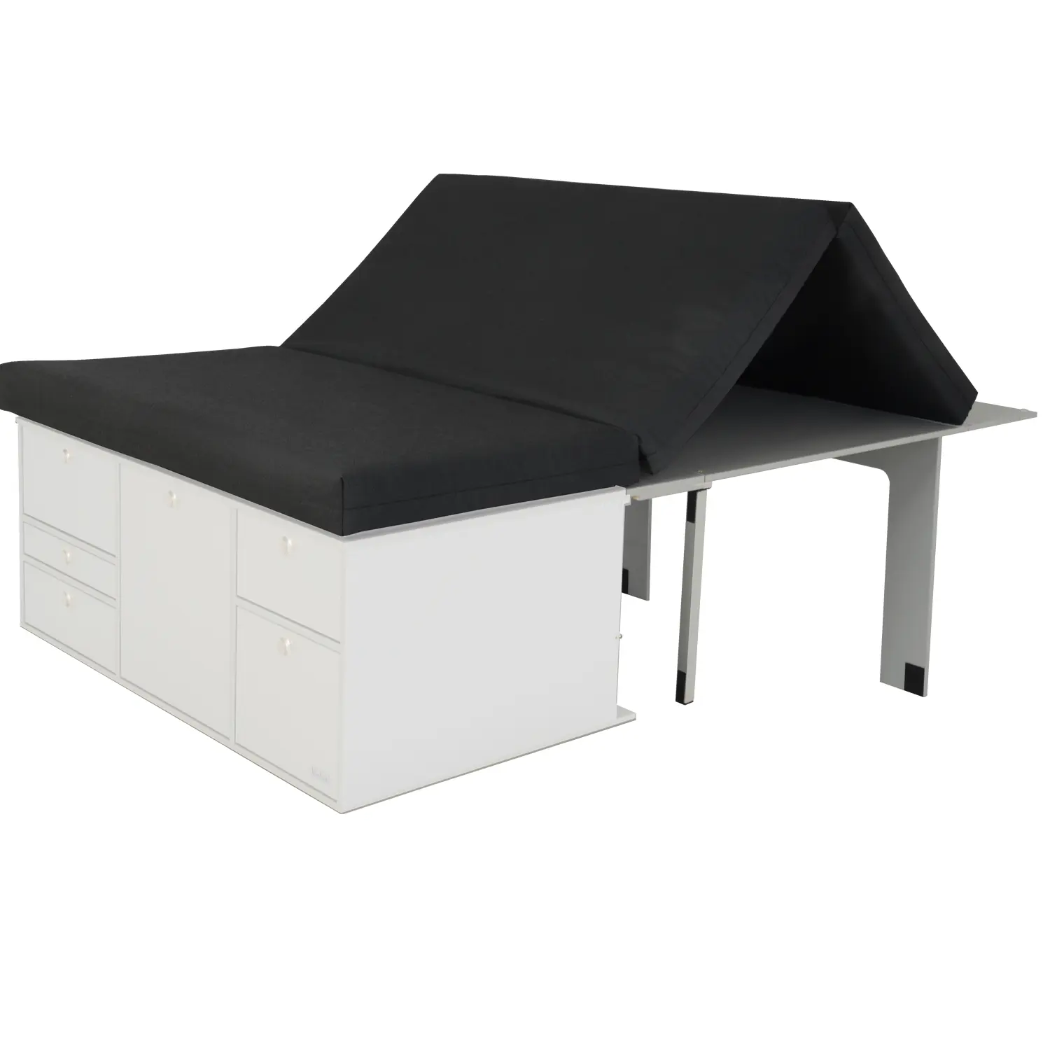 Somit bleibt man flexibel und kann das Bett situationsangepasst nutzen. Während der Fahrt ruht das System im Kofferraum. Der Fahrgastraum und vorhandene Sitze können voll genutzt werden.