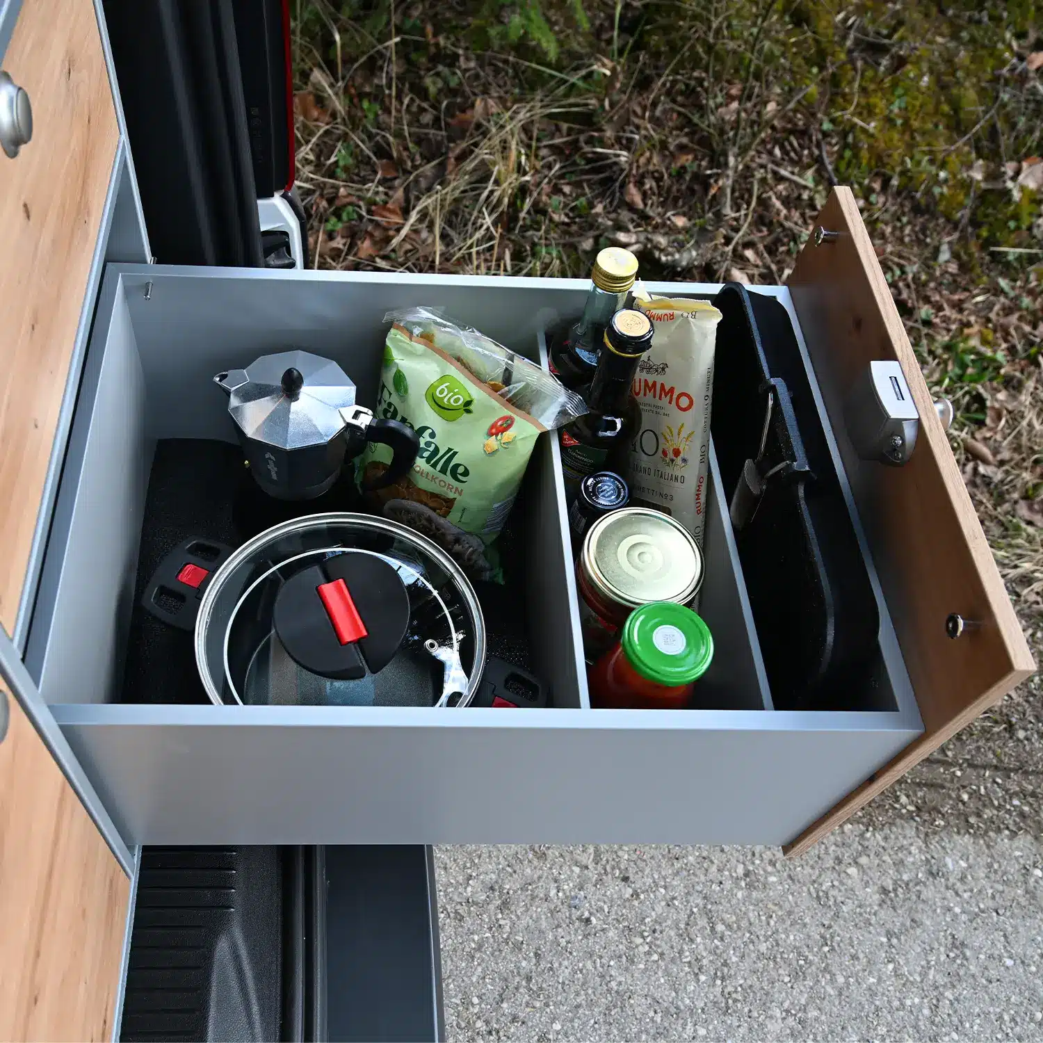 Alles wird sicher und ordentlich an seinem Platz auf der Reise transportiert. Durch die Schubladenunterteilung der Heckküche, passend in Silber, findest du alles übersichtlich in deiner Vorratsschublade.