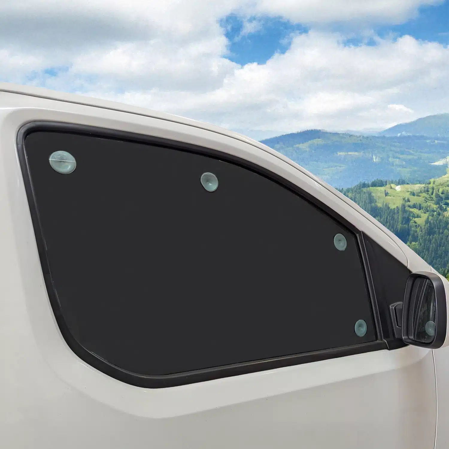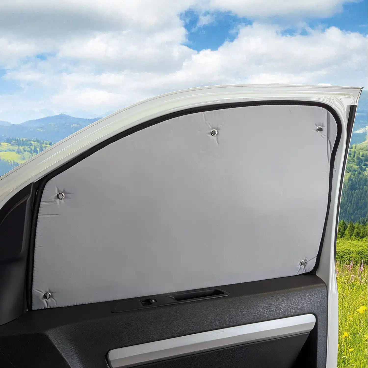 Tipp am Rande: Du willst unterwegs unauffällig bleiben und dein Fahrzeug optisch nicht als Camper erkennbar machen? Dann montiere die Thermomatten einfach mit der schwarzen Seite nach außen – dafür einfach die Saugnäpfe umdrehen. So bleibt dein Van dezent und gut getarnt. Das funktioniert bei allen Matten, die symmetrisch auf Fahrer- und Beifahrerseite geformt sind.