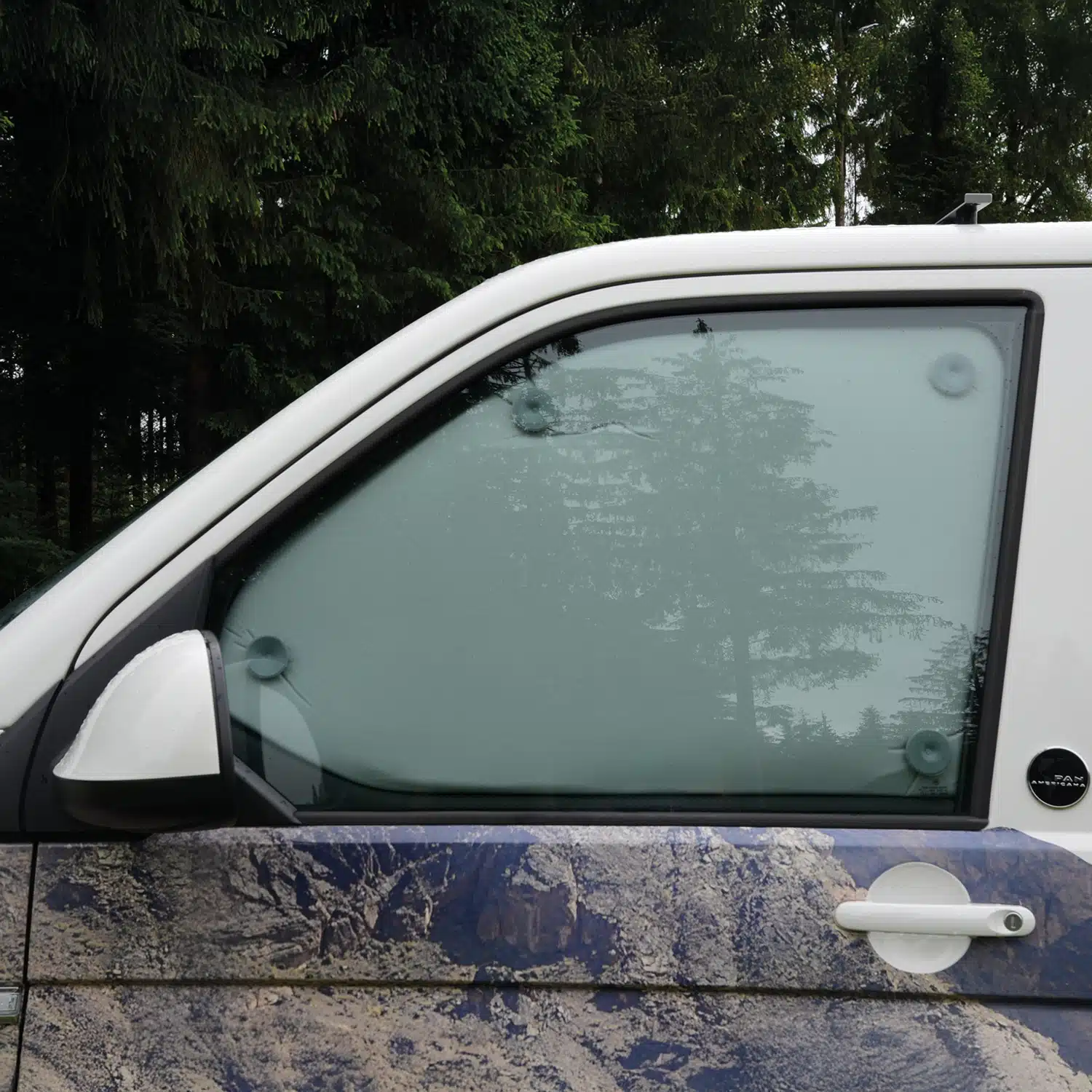 Tipp am Rande: Du willst unterwegs unauffällig bleiben und dein Fahrzeug optisch nicht als Camper erkennbar machen? Dann montiere die Thermomatten einfach mit der schwarzen Seite nach außen – dafür einfach die Saugnäpfe umdrehen. So bleibt dein Van dezent und gut getarnt. Das funktioniert bei allen Matten, die symmetrisch auf Fahrer- und Beifahrerseite geformt sind.