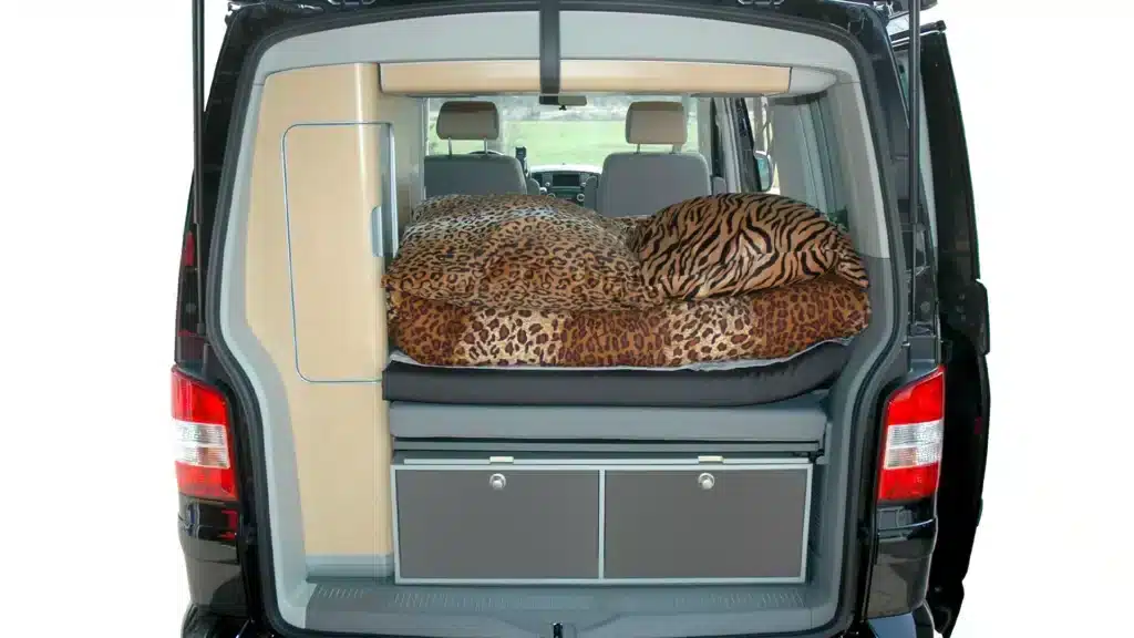 Campingmodule von VanEssa wie Küche, Schränke und Bett kannst du dagegen in ein paar Minuten herauszunehmen und erhältst somit die Alltagstauglichkeit und Flexibilität, die dir dein Van bietet.