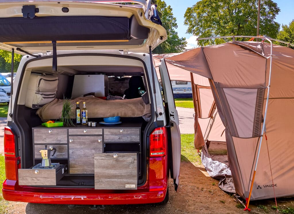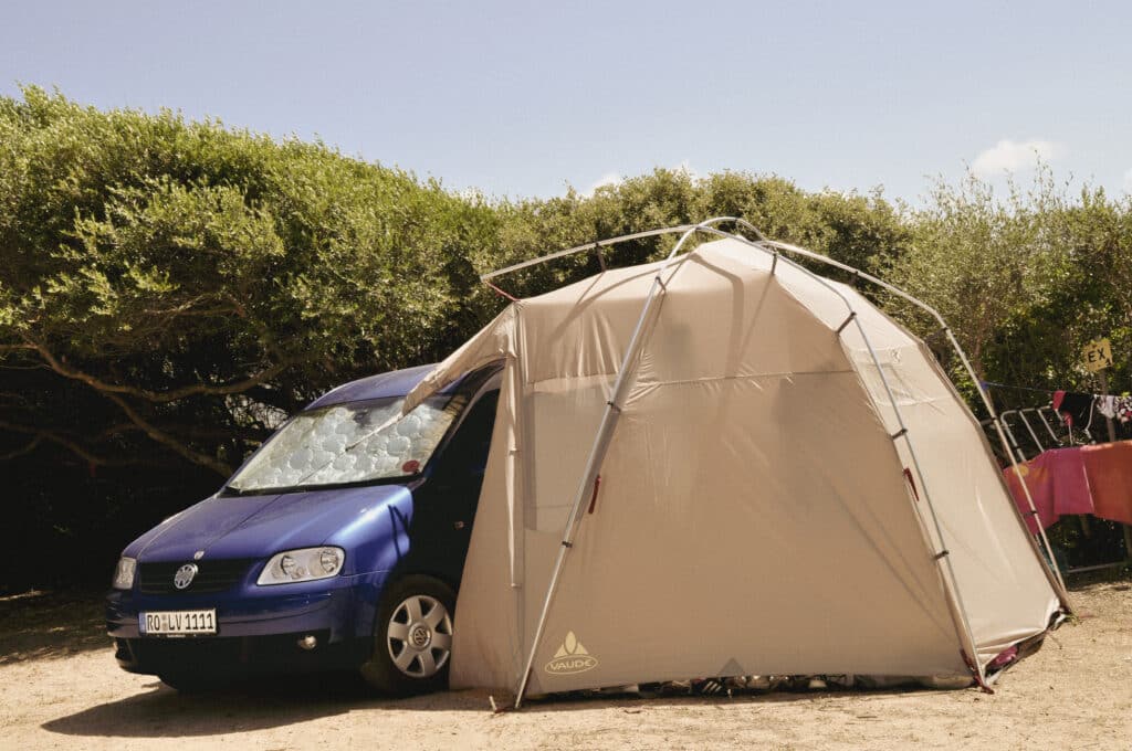 Sehr wichtig ist es, dass ein Zelt immer selbststehend ist, damit Sie mit Ihrem Van einen Ausflug machen können ohne alles wieder abbauen bzw. verstauen zu müssen. Das Zelt bleibt stehen und reserviert Ihnen nicht nur den Stellplatz sondern Sie können auch Tische und Stühle einfach darin stehen lassen – das Zelt kann rundum geschlossen werden.