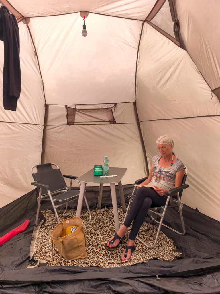 Falls du im Zelt auch übernachten möchtest, weil zum Beispiel im Van der Schlafplatz nicht für alle Mitfahrer reicht oder sich die Kids ein eigenes „Zimmer“ wünschen, bieten wir in unserem Shop auch das passende mückensicheres Innenzelt von VAUDE an. Es teilt das Zelt in Schlaf- und Aufenthalts- bzw. Stauraum auf. Den passenden Boden findest du übrigens auch in unserem Shop.
