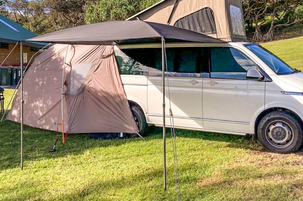 Perfekt ist zum Beispiel auch das Vordach, welches du direkt an deinem Van fixierst. So bist du auch bei Regen geschützt, wenn du seitlich aus dem Bus aussteigst bzw. hinten darunter z.B. an einer Heckküche stehst.